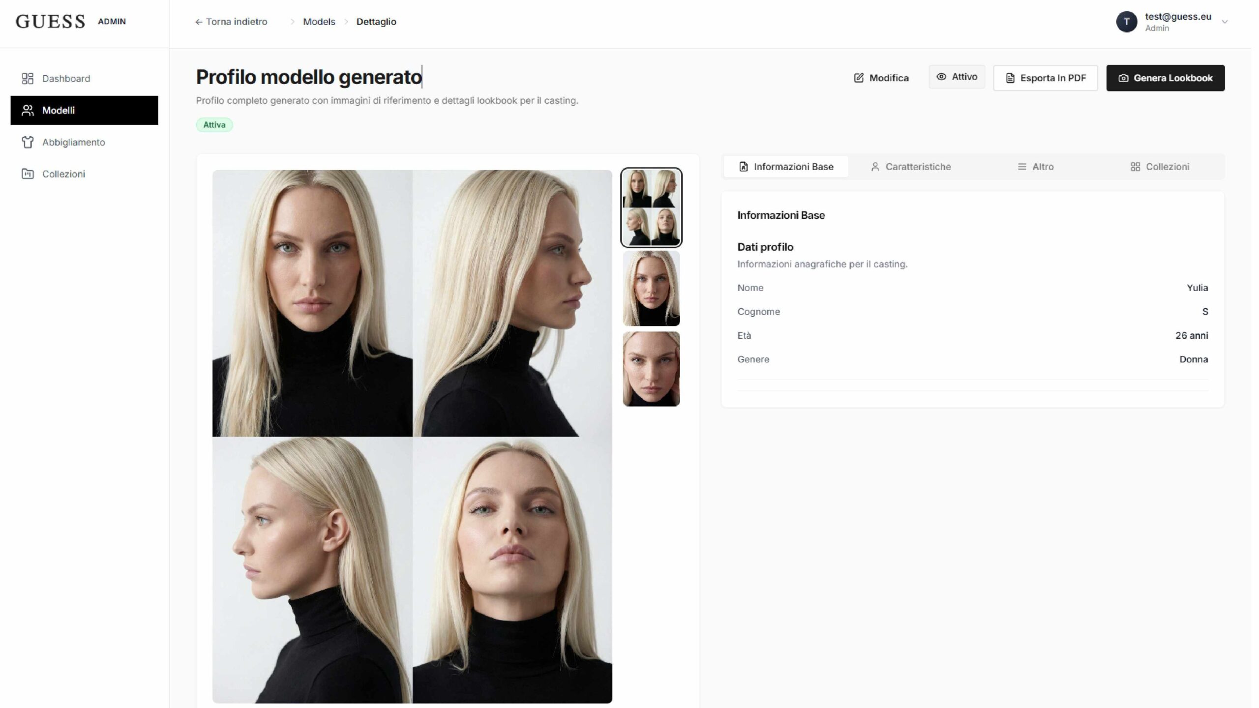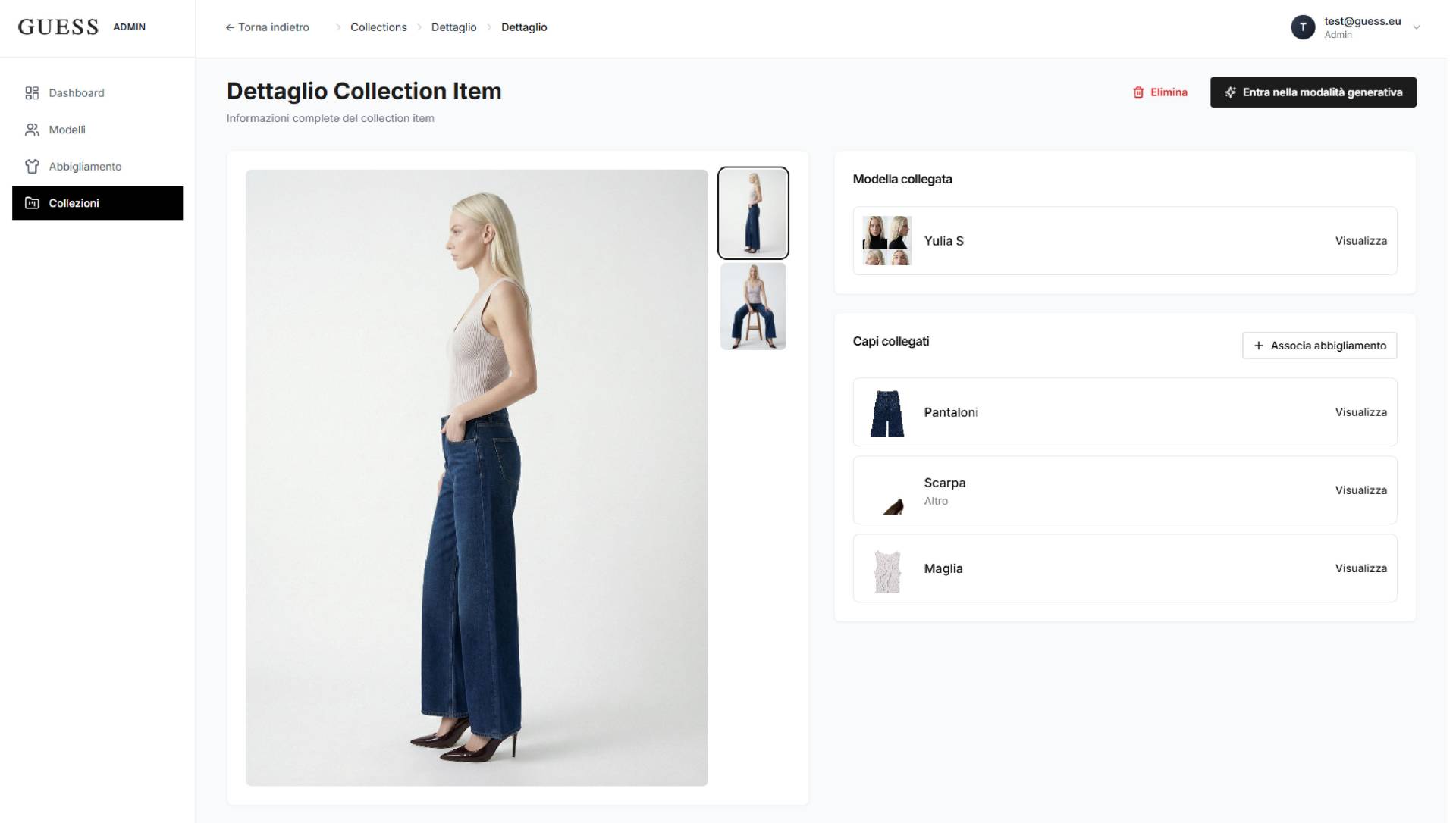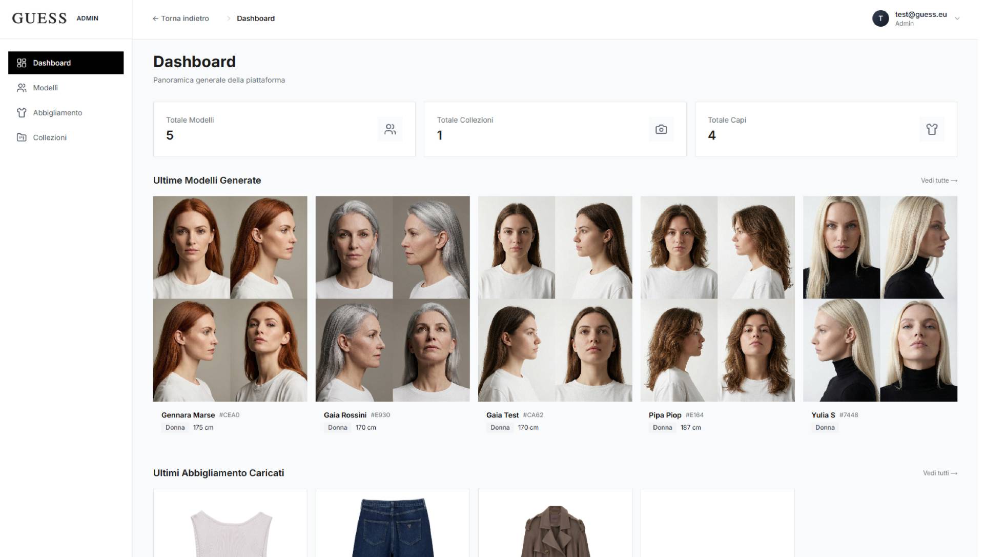 La piattaforma TryOn sviluppata per Guess e realizzata con il supporto di Loto Studios permette di creare rapidamente contenuti per e-commerce e fashion marketing attraverso tecnologie di AI generativa, grazie anche ad un UI esplicativa e funzionale.